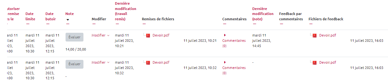 - vérifiez que le fichier de correction de chaque participant est déposé sur la page listant les devoirs (dans la colonne “Fichiers de feedback”) :