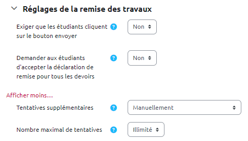 - Tentatives supplémentaires : si manuel, l'enseignant pourra remettre le travail de l'étudiant à l'état de brouillon afin qu'il puisse le modifier.