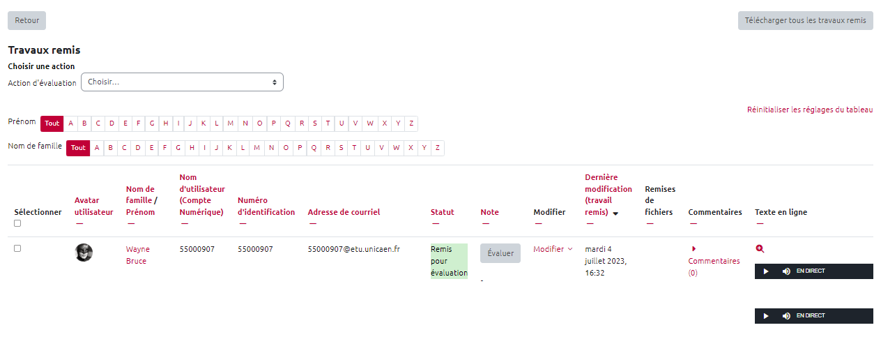 - Cliquer sur le devoir, puis sur “Consulter tous les travaux remis” :