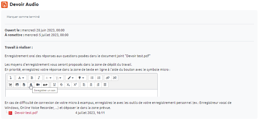 Dans la partie « Instructions de l'activité » nous vous recommandons de préciser ici aux étudiants qu'ils doivent s'enregistrer à l'aide du bouton avec le symbole micro.