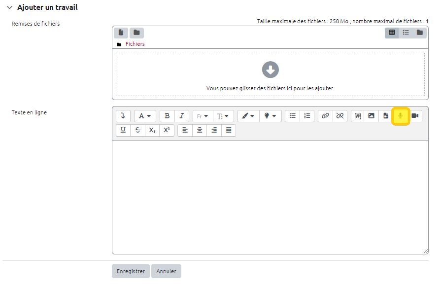 Choisir le format de remise de fichier Texte en ligne. Il arrive parfois que Moodle n'arrive pas à se connecter au micro de l'étudiant, notamment dans le cas d'un navigateur internet ancien ou qui n'est pas à jour. Pour prévenir ce genre de situation, nous vous recommandons d'activer en complément la “Remise de fichiers” pour permettre à un étudiant de déposer un fichier audio en cas de difficulté. Il pourra alors utiliser les outils de son environnement personnel comme l'enregistreur vocal sous windows (pour plus de détails sur ces outils, vous pouvez consulter la page : Production audio et vidéo.