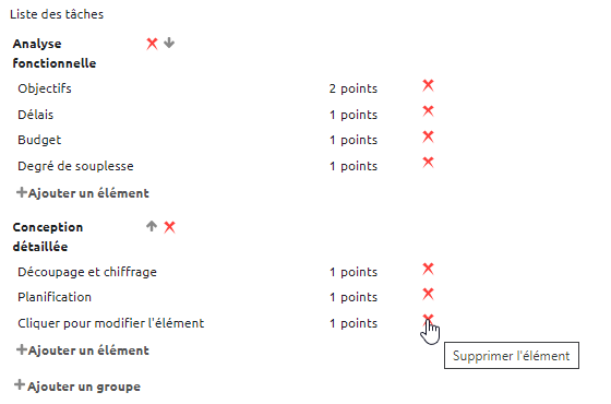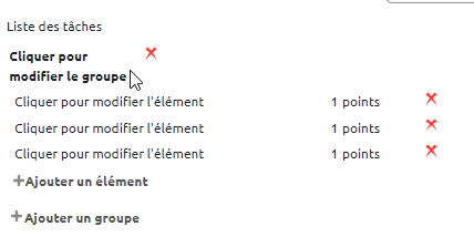 - cliquez sur le texte “Cliquer pour modifier le groupe” pour le nommer ou sur “Cliquer pour modifier l'élément” pour nommer la tâche