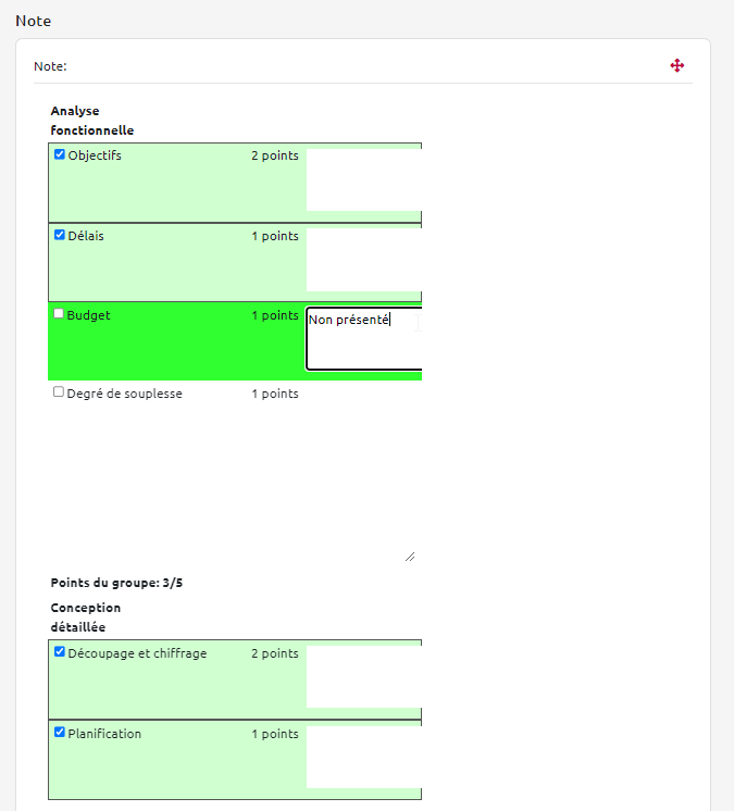 - Vous pouvez cocher la tâche si elle est validée (ce qui déclenche l’obtention des points correspondants) et indiquer les commentaires souhaités pour la tâche :
