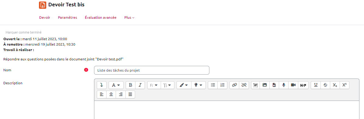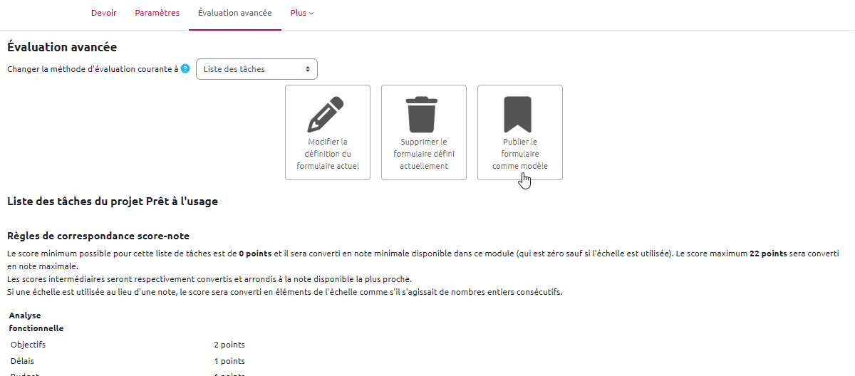- après l'enregistrement des paramètres du devoir, l'onglet “Évaluation avancée” s'affiche :