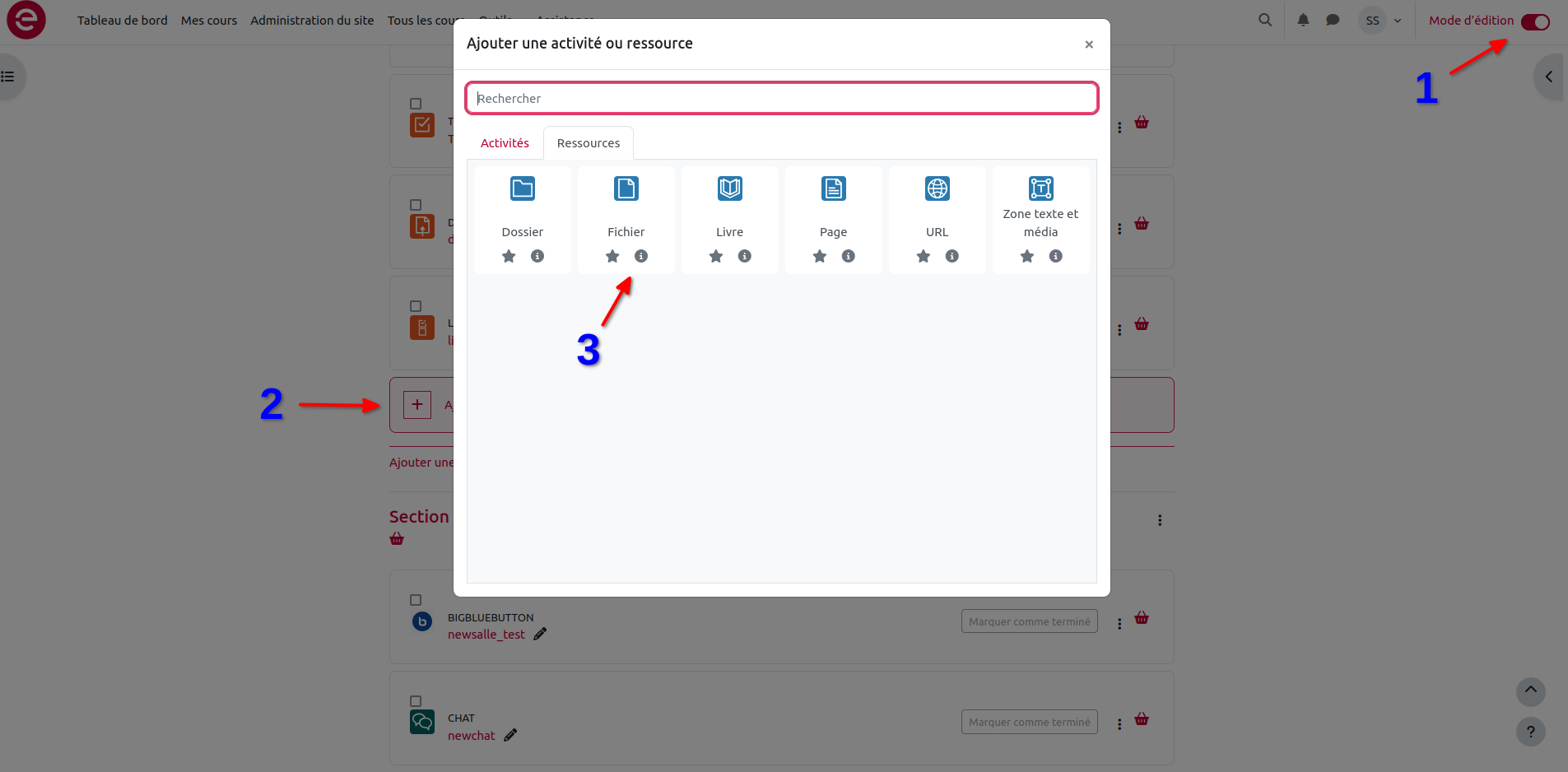 Pour les diffuser sur votre espace de cours, allez sur le cours concerné, puis cliquez sur “ajouter une activité ou une ressource > “fichier”.