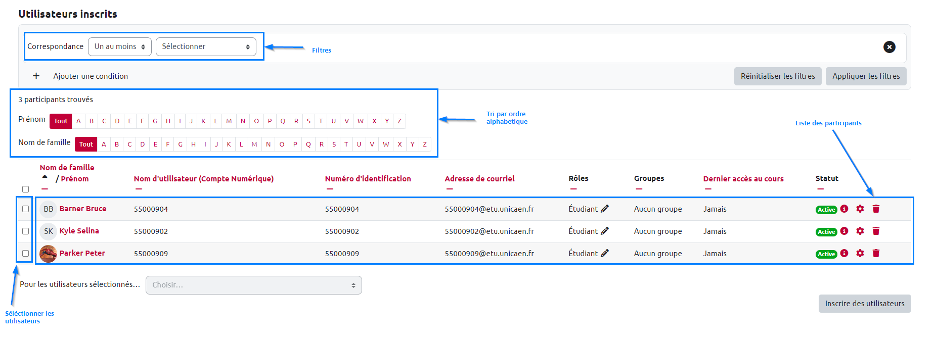 Gérer les inscriptions des utilisateurs (étudiants et enseignants) d'un espace de cours