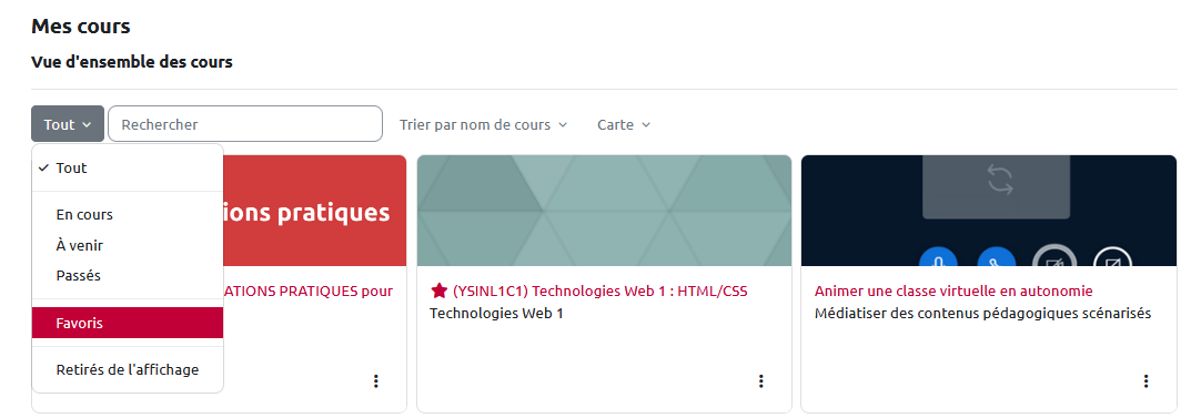 La page Mes cours permet d'avoir une vue d'ensemble des cours auxquels on est inscrit. Une fonction de filtre permet un affichage partiel des cours suivant leur date d'ouverture et de fermeture (en cours, à venir, passés) ou leur statut de favori.