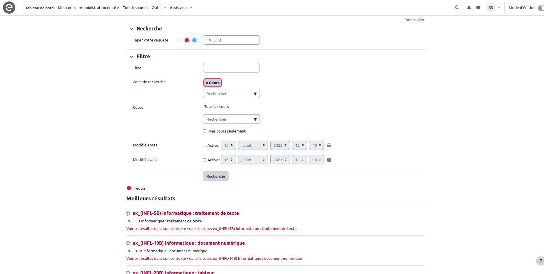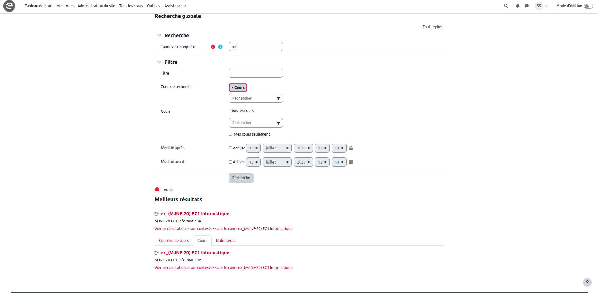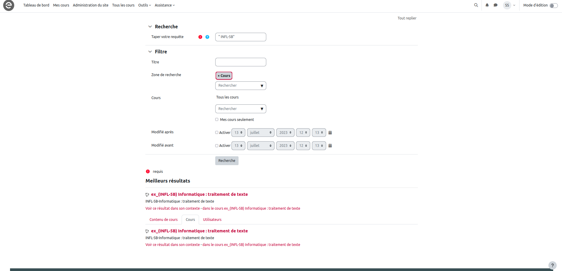 Si on ajoute des double guillemets, la recherche est plus strict et retourne les cours dont le nom contient toute la chaine