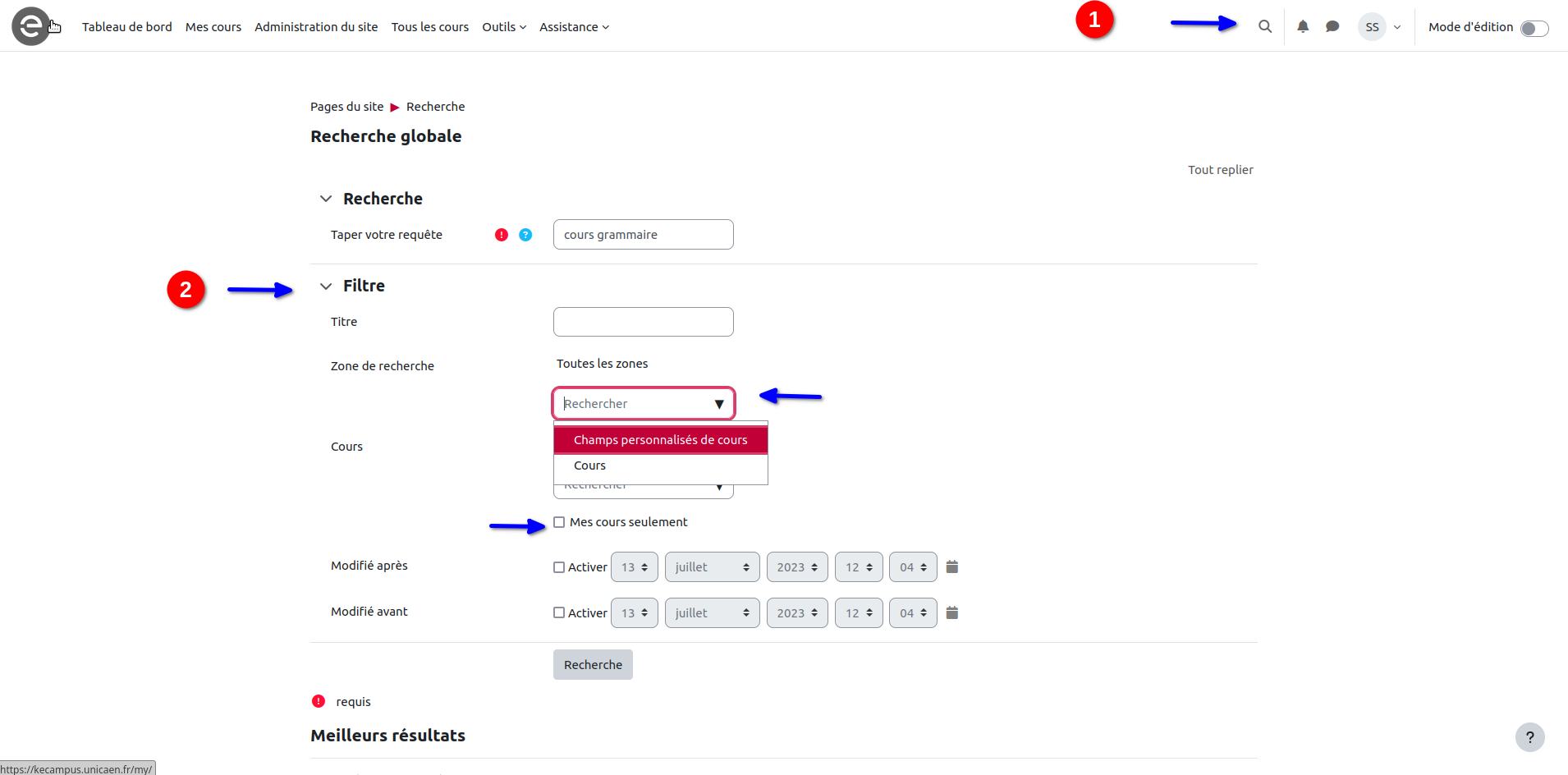 Pour limiter la recherche aux cours, cliquer sur l'onglet “Cours”