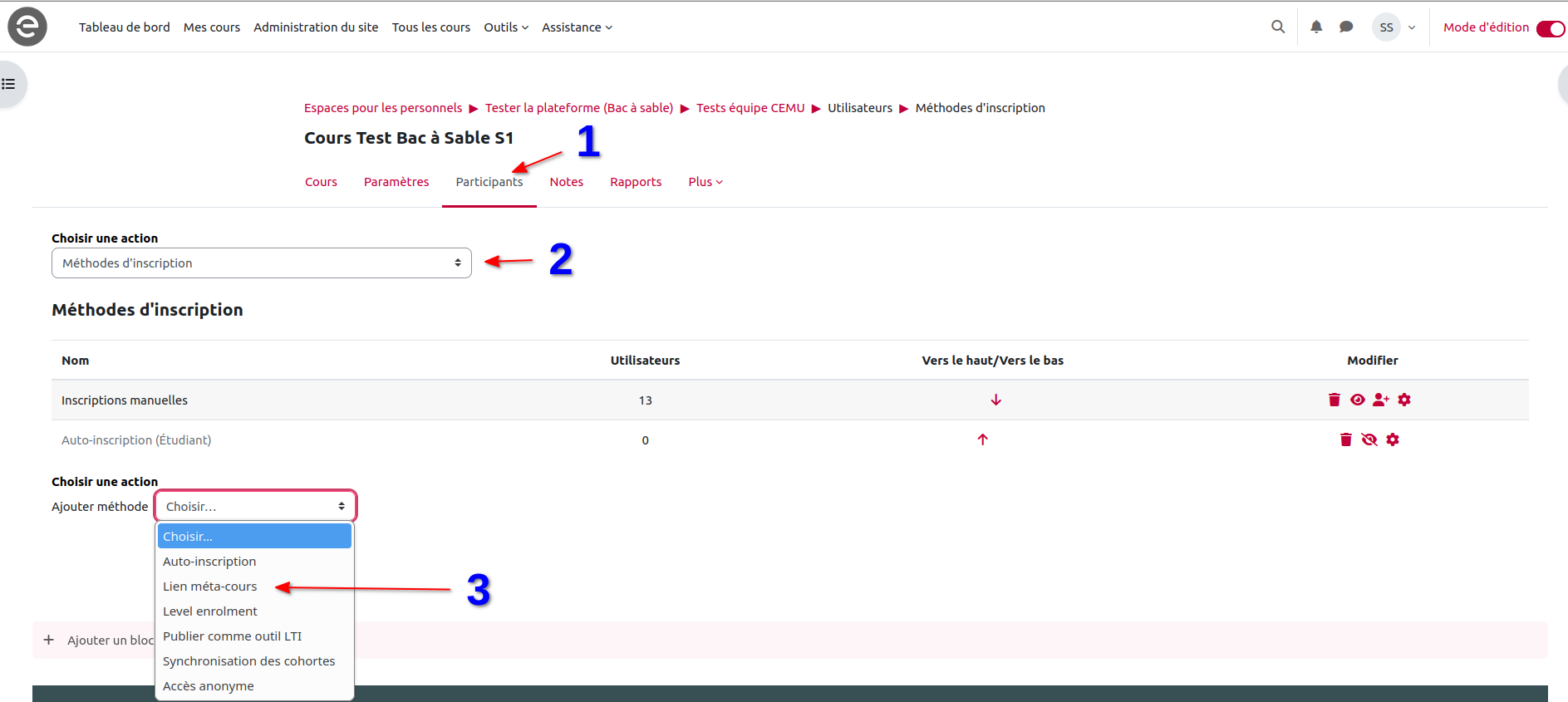 Pour ajouter un lien méta-cours dans le seul espace de cours resté visible, il faut lui ajouter une nouvelle méthode d'inscription et sélectionner 'lien méta-cours' en allant dans participants (1), puis dans choisir une action selectionner méthodes d'inscription (2) et en fin cliquer sur lien metacours dans le menu déroulant (3):