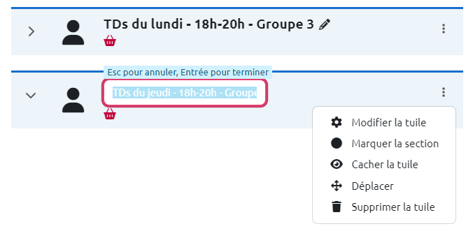 On peut aussi renommer une section en passant par l'onglet Modifier la section, ou la tuile, du menu contextuel.