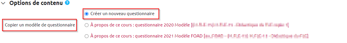 - Copier un questionnaire existant : si vous souhaitez réutiliser un questionnaire créé comme « modèle » dans un autre cours par vous ou un autre enseignant sur Moodle. Contactez l'équipe du CEMU pour paramétrer votre questionnaire comme « modèle ».