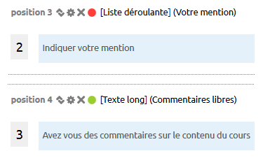 Dans cette liste, un numéro est attribué à chaque question. Vous pouvez modifier l'ordre des questions, éditer la question pour en modifier les paramètres ou la supprimer en cliquant sur un des pictos présents à côté de ce numéro :