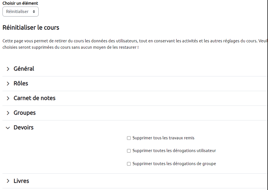 Vous pourrez alors sélectionner les activités que vous souhaitez réinitialiser, par exemple : tous les devoirs, ou tous les groupes, etc. Cette option est idéale pour une réinitialisation “en lot” d'un type même d'activité.