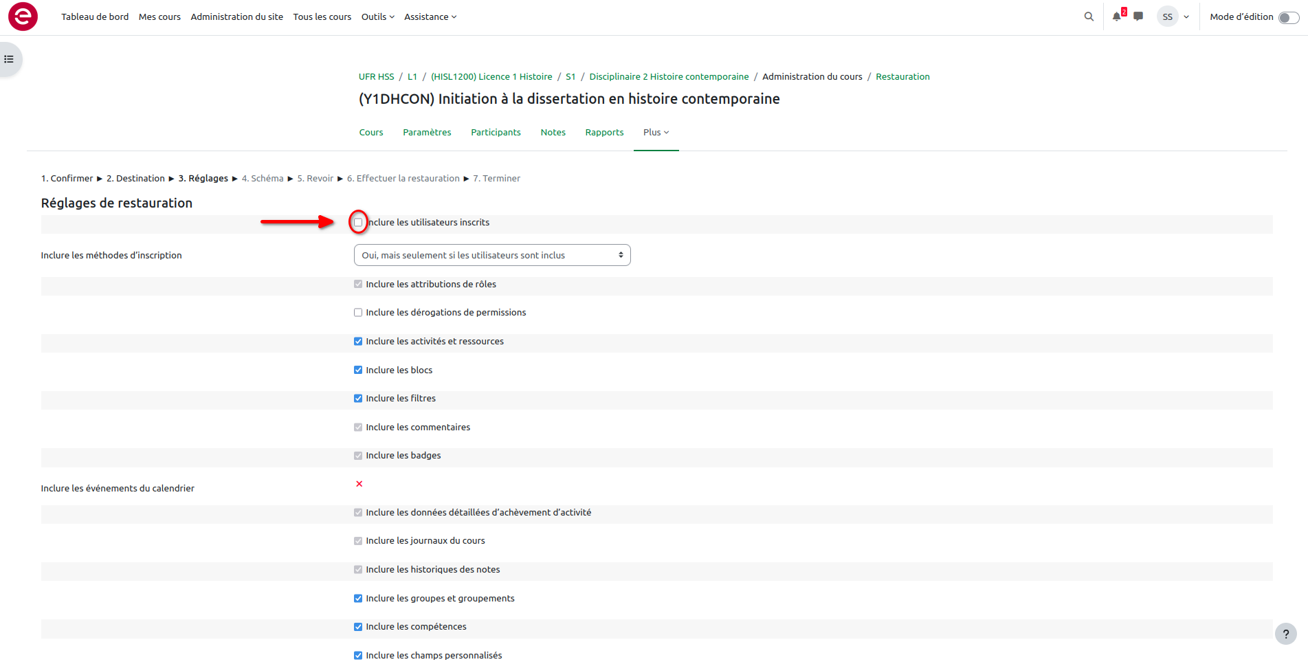Etape 2 : destination ⇒ aller à la rubrique “restaurer dans ce cours” et cocher la case “Supprimer le contenu de ce cours, puis restaurer”