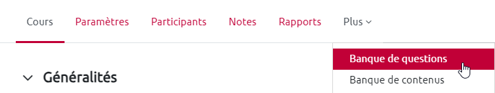 Dans l'espace de cours où se trouve le test, cliquez sur l'onglet Plus, puis sélectionnez Banque de questions dans le menu déroulant.