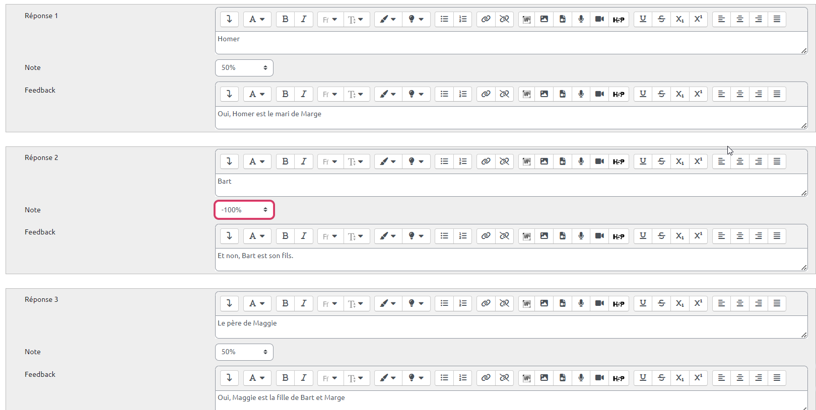 Par exemple dans le cas où la question possède deux réponses correctes et trois réponses incorrectes, il faut affecter 50% pour chaque réponse correcte et -33,3333% à chaque réponse incorrecte