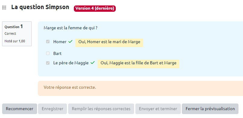 - Vous pouvez tester la question sur « Recommencer » autant que souhaité et sur « Remplir les réponses correctes » pour vérifier le comportement adéquat de la question. Cela vous permet de voir le rendu avec bonne ou mauvaise réponse en cliquant sur “Envoyer et terminer”: