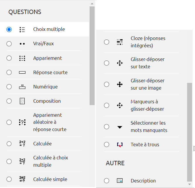 Choisir les types de question dans Moodle
