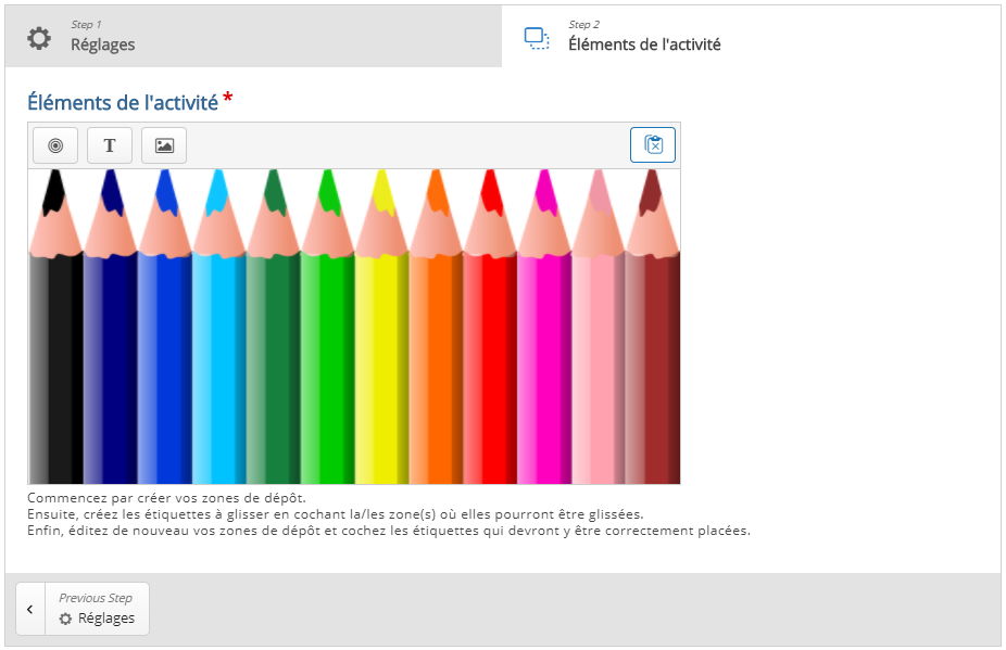 Dans un premier temps, vous arriverez dans Step 1: Réglages. C'est ici que vous ajouterez l'image de fond de votre choix qui servira de support à votre activité. Vous avez la possibilité de modifier la taille de l'image à votre convenance.