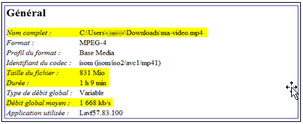 La fenêtre Général affiche toutes les informations techniques (taille, durée, débit global).