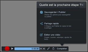 Pour finaliser votre vidéo, cliquez sur le bouton Compléter. Une fenêtre intitulée Quelle est la prochaine étape ? s’affiche. Cliquez sur le premier choix Sauvegarder / Publier.