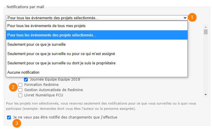 Avec ce paramétrage, pour les projets non sélectionnés, vous recevrez quand même les notifications lors de modifications de demandes dont vous êtes l'auteur ou qui vous sont assignées.