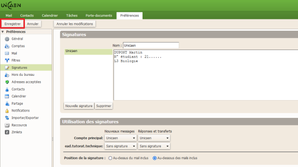 5) Pensez également à renseigner “Unicaen” dans la fenêtre “Nom :“ qui s'affiche au-dessus de l'encadré. Vous pouvez aussi décider si votre signature apparaîtra en haut ou en bas de vos mails, en cochant votre choix dans “Position de la signature”.