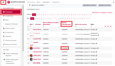 Étape 3 - Il ne vous reste plus qu'à chercher votre nom dans la liste des étudiant(e)s inscrit(e)s au cours. Votre numéro étudiant correspond au “numéro d'identification” qui s'affiche en face de votre nom : notez-le bien, il est essentiel de le connaître tout au long de votre cursus universitaire.