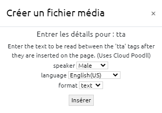 - une balise ouvrante : {POODLL:type=“tta”,speaker=“Male”,language=“English(GB)”,format=“text”}