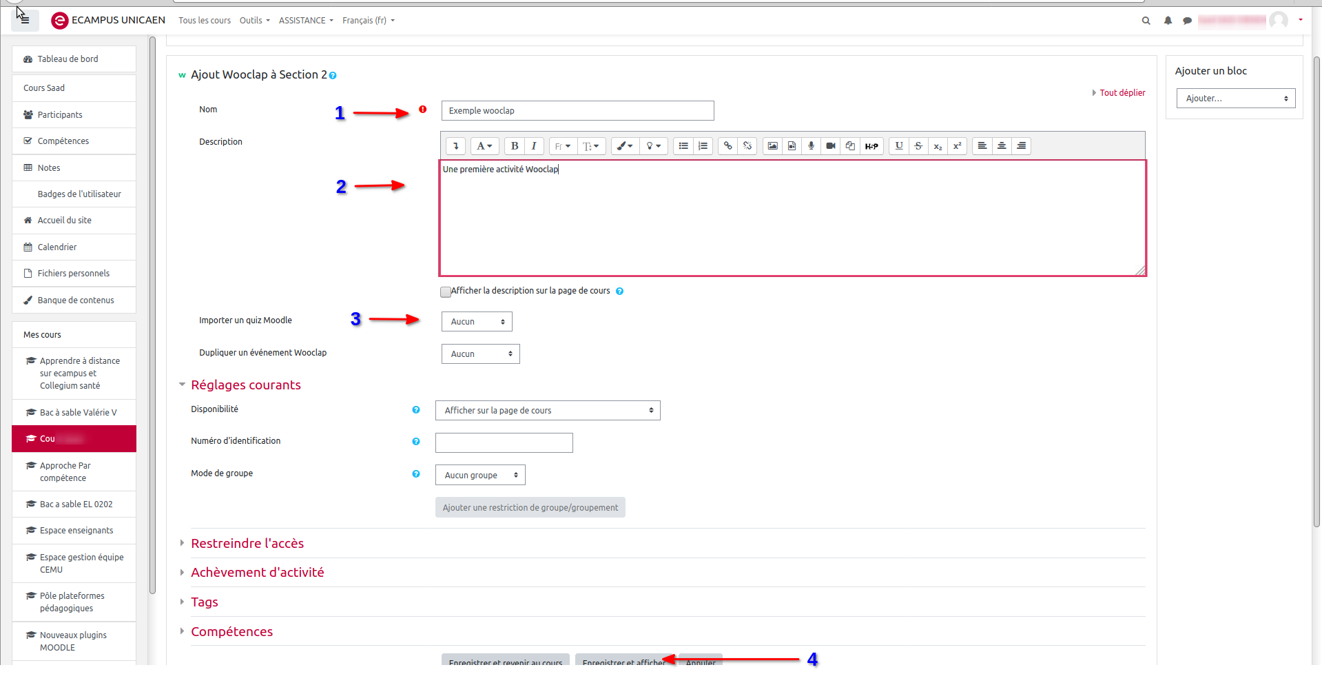- Paramétrer l'activité en choisissant un titre (1), une description si souhaitée( 2). Vous avez la possibilité d'importer un quiz déjà prêt (3)…puis enregistrer.