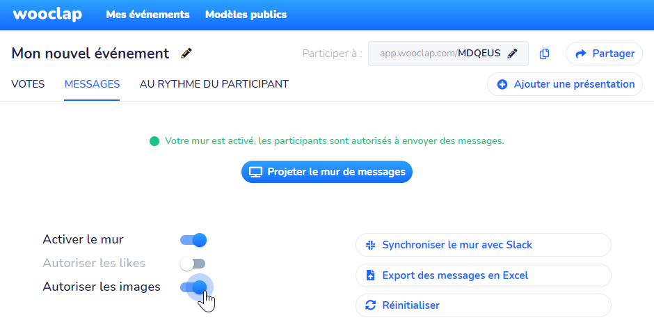 Afficher le texte sourceAnciennes révisionsLiens de retourExporter en PDFExportation ODTHaut de page Table des matières Utiliser le mur de messages Paramétrer le mur de messages Ecrire un message (côté participant) Utiliser le mur de messages Paramétrer le mur de messages Ecrire un message (côté participant) wooclap/mur_de_messages.txt Dernière modification : il y a 14 joursde 127.0.0.1