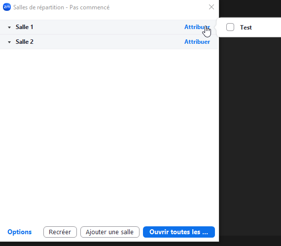 Si vous choisissez d'attribuer manuellement, vous devrez attribuer chaque participant à une salle. Pour cela, vous devrez cliquer sur “Attribuer” à droite du nom de la salle. Vous verrez apparaître la liste des participants et vous pourrez cocher les participants que vous souhaitez attribuer à cette salle.