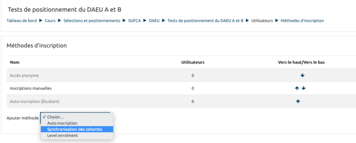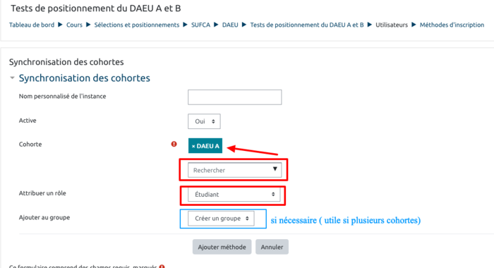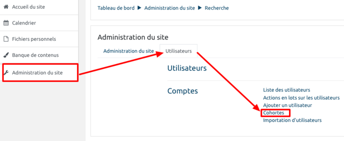 Les cohortes sont des groupes d'utilisateurs créés au niveau de la plateforme, on parle de « Cohortes Système », ou au niveau d'une catégorie de cours, on parle de « Cohortes de catégorie ». Elles permettent d'inscrire d'un coup tous les membres d'une cohorte à un cours. Il est ainsi possible d'inscrire manuellement à un cours tous les membres qui composent la cohorte à un instant donné, ou alors, il est possible d'utiliser une Méthode d'inscription appelée Synchronisation des Cohortes qui, comme son nom l'indique, synchronise les membres de la cohorte avec la liste des participants du cours de façon dynamique.