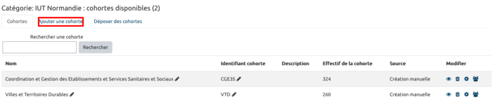 Contrairement à Ecampus et Collegium, sur PRELUDE, les cohortes ne sont pas automatisée par rapport au système d'information. Il est donc nécessaire de les créer manuellement pour pouvoir les utiliser ensuite , en particulier pour l'inscription en masse (voir Importer des utilisateurs sur la plateforme PRELUDE).