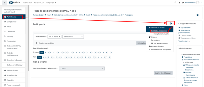 Se rendre dans la catégorie ( via l'onglet “tous les cours , par exemple) , puis cliquer sur la roue dentée, à droite, et enfin, sur “Cohortes” dans le menu déroulant: