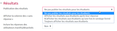 Dans le volet “Résultats”, vous pouvez choisir de publier (ou non) les résultats à tous les participants, de les afficher si l'étudiant à lui-même répondu ou quand le sondage est fermé.
