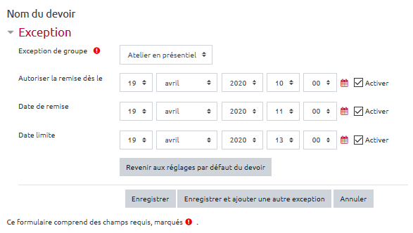 - voici l’interface “Exception de groupe” qui s'affiche :