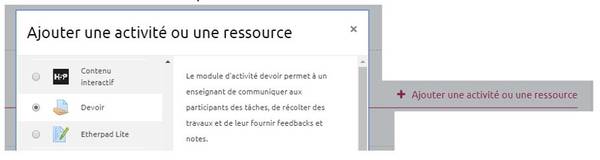 Entrez dans le mode « Édition » et cliquez sur le bouton « Ajouter une activité ou une ressource » et sélection l’option « Devoir ».