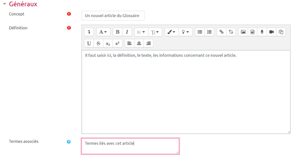 Si le filtre de liens automatiques des glossaires est activé, les articles des glossaires seront automatiquement liés lorsque les expressions définies apparaissent dans le cours.