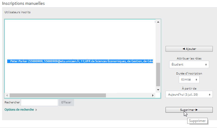 • Dans la liste de gauche (utilisateurs inscrits), sélectionner les personnes qui ne doivent plus recevoir les notifications d'activité de cet espace de cours, puis cliquer sur “Supprimer” :