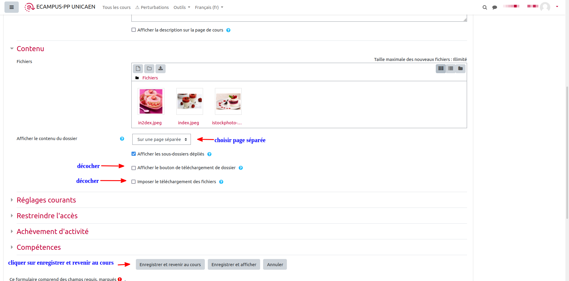 Pour ce faire, durant la paramétrage de l'activité dossier, l’enseignant doit dans la section contenu des paramètres, décocher la case imposer le téléchargement des fichiers car celle-ci est cochée par défaut. L'enseignant peut également s'il le souhaite autoriser le téléchargement ou non du dossier. Si l'enseignant souhaite autoriser le téléchargement du dossier et de son contenu, il lui suffit de cocher afficher le bouton de téléchargement de dossier et enregistrer les réglages qu'il vient de réaliser.