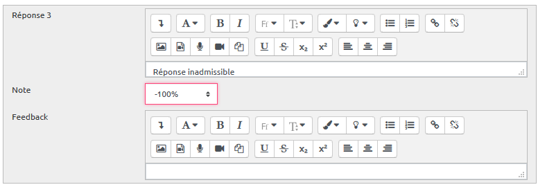 Pour cela, il faut affecter le pourcentage -100% à cette réponse jugée inadmissible.
