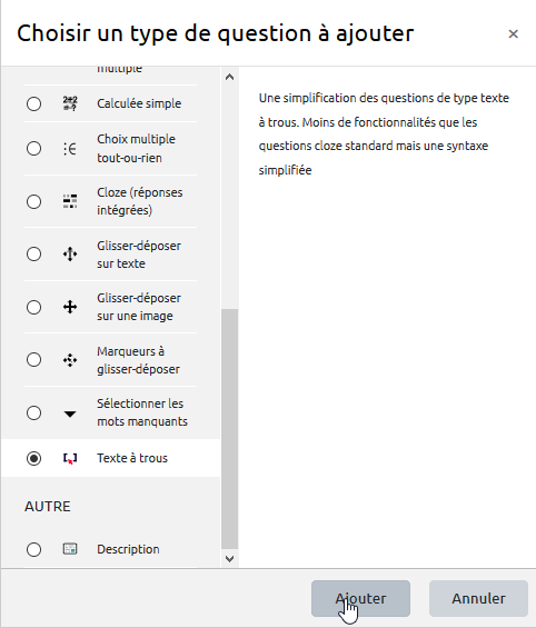 - sélectionner le type de question “Texte à trous” et cliquer sur “Ajouter” :