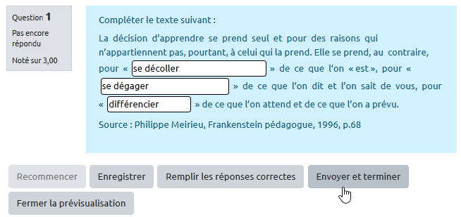 - inscrivez les réponses correctes puis cliquer sur “Envoyer et terminer” pour vérifier que la correction a bien fonctionné