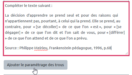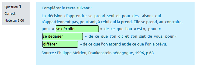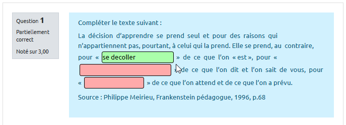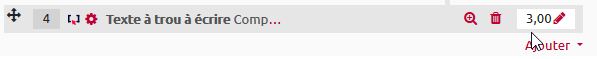 La valeur par défaut d'un texte à trou est égale au nombre de trous. Ici, avec trois trous, la question vaut donc trois points par défaut :
