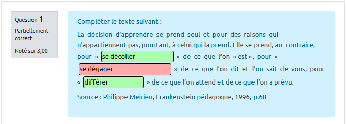 - Besoin d'une analyse fine des réponses écrites ou d'une notation pour réponse partiellement correcte → faire plusieurs "Réponses courtes"