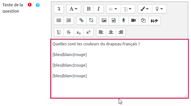 Pour autoriser plusieurs réponses correctes, il faut les indiquer à la suite de la première réponse correcte attendue en séparant par une barre verticale sans espace ni avant ni après (touches “alt gr” + “6” sur clavier Windows, touches “alt” + “maj” + “L” sur clavier Mac OS) comme dans l'exemple suivant :