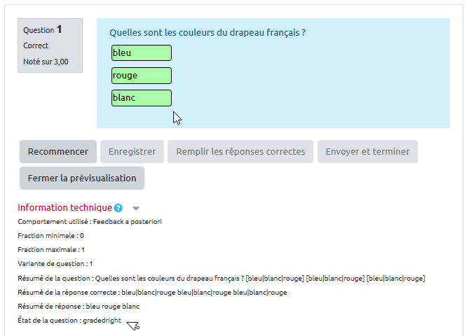 - prévisualiser et essayer de donner les réponses dans un ordre aléatoire, vous observez que les réponses sont acceptées :