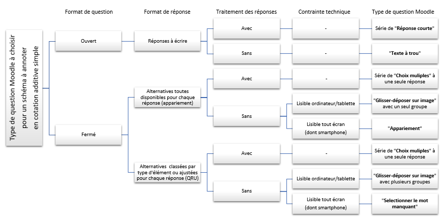 - Pour un schéma au format de question fermé, la seule possibilité adaptée consiste à utiliser le type de question « choix multiple » à réponse unique.